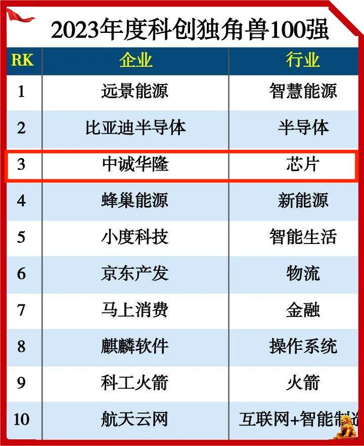 近日,中国科学院、中国社科院等单位发布了“2023年度科创独角兽100强”国家级榜单。本榜单贯彻国家战略性新兴产业发展政策,聚焦人工智能、先进制造、集成电路等前沿领域,基于科技创新、企业创新性、发展潜力、市场前景等多个维度,在全国范围内筛选出最有发展潜力的100家科创独角兽企业。中诚华隆作为一家高速成长的科技企业,凭借其领先的技术、卓越的产品性能、优异的市场表现及持续稳定的价值增长,位列榜单第三名!这个排名表明中诚华隆在中国半导体产业领域所具有的高成长性潜力,在全国范围内得到了行业内外的认可,成为了国产芯片应用领域不可忽视的新力量。