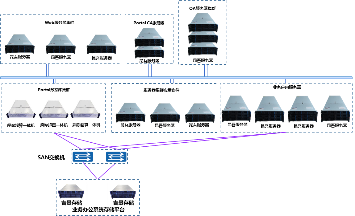 中诚华隆基于了昆吾服务器、 超算一体机、吉量存储和集群软件等产品搭建运营商OA系统平台解决方案,此方案根据客户的需求,设计了两组双机热备的高可用性集群解决方案,为庞大的办公自动化系统提供了从数据存储层到应用系 统层的全方位、强大的支撑平台。针对某运营商的要求,中诚华隆 提出了系统对高可靠性、不间断运行两大需求的原则,充分考虑到该业务运营支撑系统 首要的高可靠性和高可用性,运行系统不能出现单点故障,并能实现性能随需动态增长。 同时通过对集群环境的测 试、并发压力测试和第三方厂商产品兼容性测试等项目严格测试,为项目的顺利实施做足准备。基于吉量存储系统的全方位硬件运行平台,从每个磁盘阵列到服务器再到整 个网络系统均有涉及,确保系统具有极高的稳 定性、可靠性、兼容性和可扩展性, 同时有效降低系统总体投资及维护成本,从而满足客户对自动化办公系统的需求,提升客户满意度。