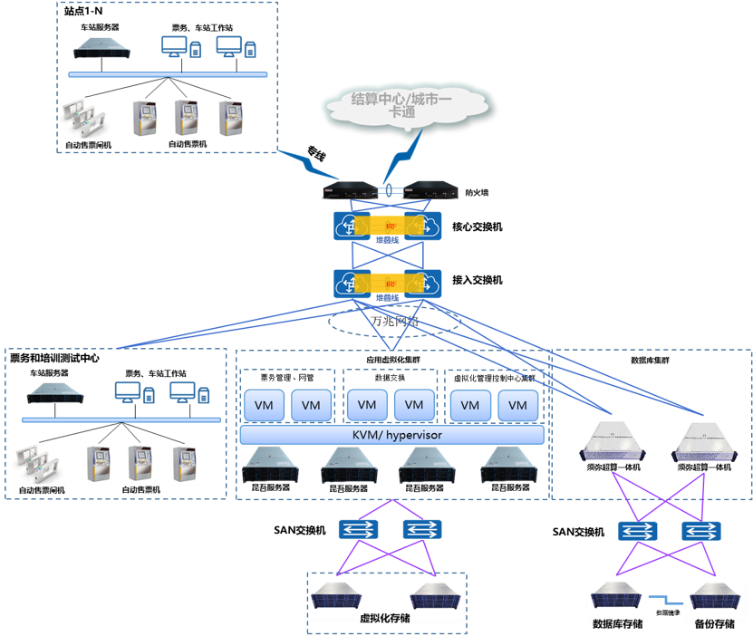 基于中诚华隆自主可控昆吾服务器、吉量存储产品、须弥超算一体机融合虚拟化技术打造的轨道交通自动售检票系统解决方案,本方案涉及自动售检票系统中的线路中央系统平台、票务系统、车站系统及培训测试系统建设。其中线路中心系统平台主要包含数据库系统、应用系统和数据备份系统。线路中心系统平台核心数据库采用须弥超算一体机,可充分满足核心数据部分对性能的苛刻要求。通过高可用集群软件,实现核心业务的故障自动检测和转移,消除单点故障,保证核心业务的持续性。须弥超算一体机与主流数据库、中间件、应用软件等具有良好、广泛的兼容性,满足不同的建设需求。为实现资源的最大利用率,业务的快速部署、交付和弹性扩展,应用系统部分采用虚拟化部署方式。通过昆吾服务器+国产虚拟化软件打造自主可控自动售检票系统虚拟化平台。配合国产虚拟化云数据中心操作系统,可实现线路中心异构资源管理。同时可通过虚拟机模板、应用服务模板的方式,实现应用系统的快速交付,业务上线时间由原来的几周、几天,缩短为几分钟,大大提升效率。通过吉量存储承载核心系统数据,从而实现核心数据备份与容灾,实现存储硬件与软件打造一套后端完整数据备份解决方案。其中自动售检票系统中的票务系统、车站系统、培训测试系统采用昆吾服务器部署。